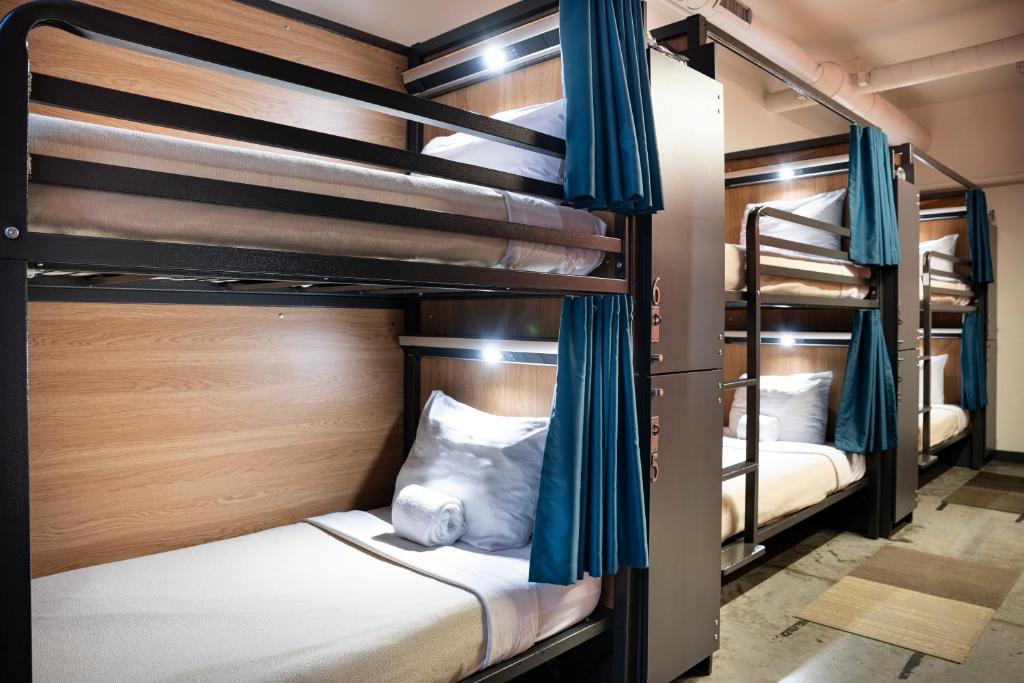 | Tipo de acomodação | Beliches com parede de privacidade | Pods/cápsulas individuais | Beliches em dormitórios pequenos |