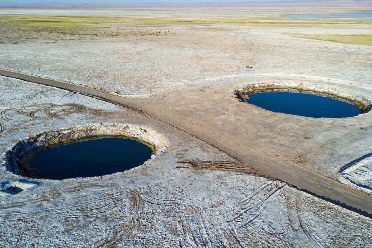 Ver dois círculos perfeitos de água azul no meio de um deserto de sal, sem explicação visual óbvia, com vulcões ao fundo, tem uma qualidade quase onírica. É o tipo de coisa que não processa de imediato.