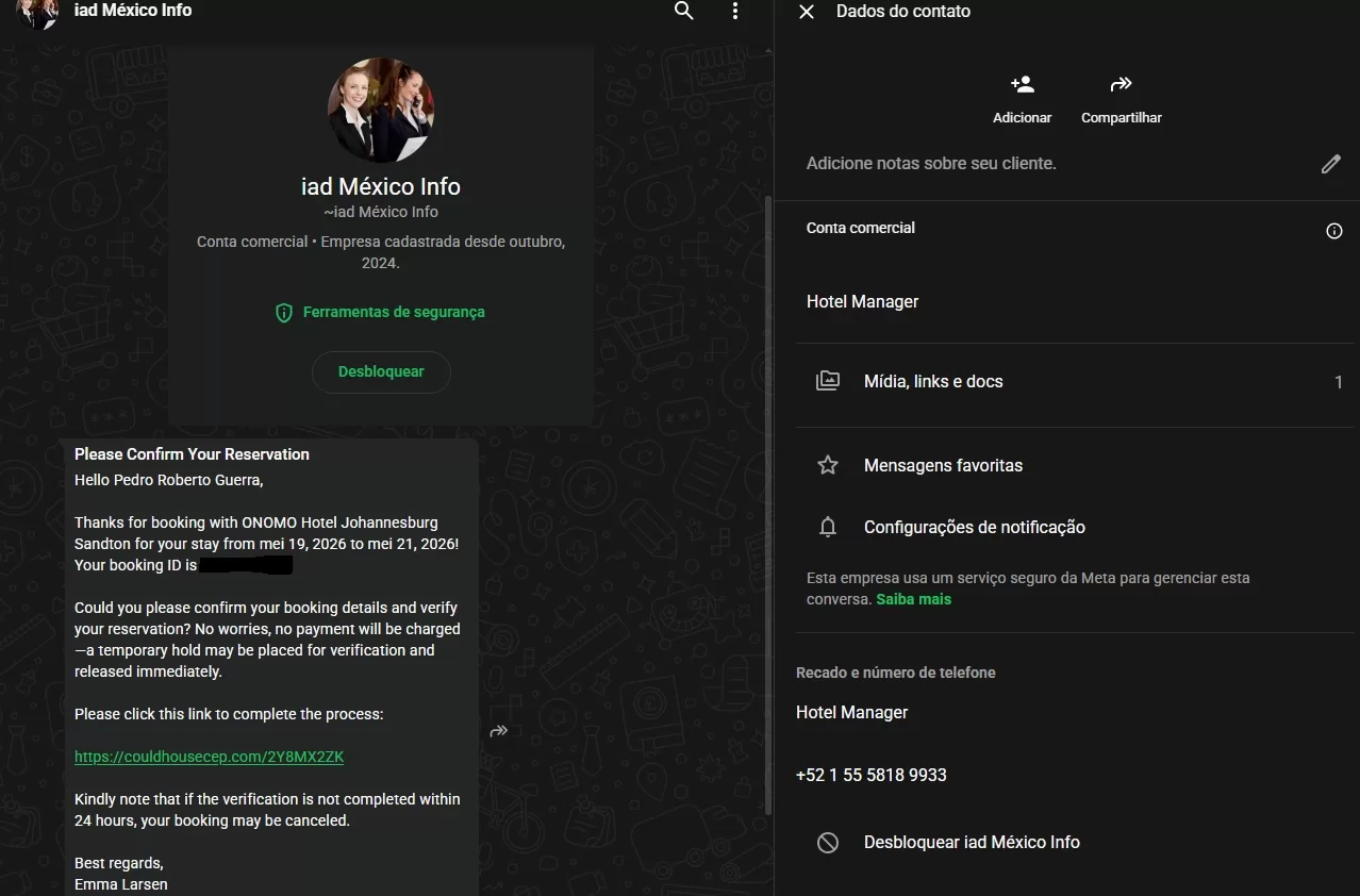 O hotel é sul-africano. O número é do México. A mensagem está em inglês. Nada disso faz sentido numa comunicação legítima. Plataformas reais como o Booking.com comunicam pelo próprio sistema interno da plataforma, não por WhatsApp de terceiros.