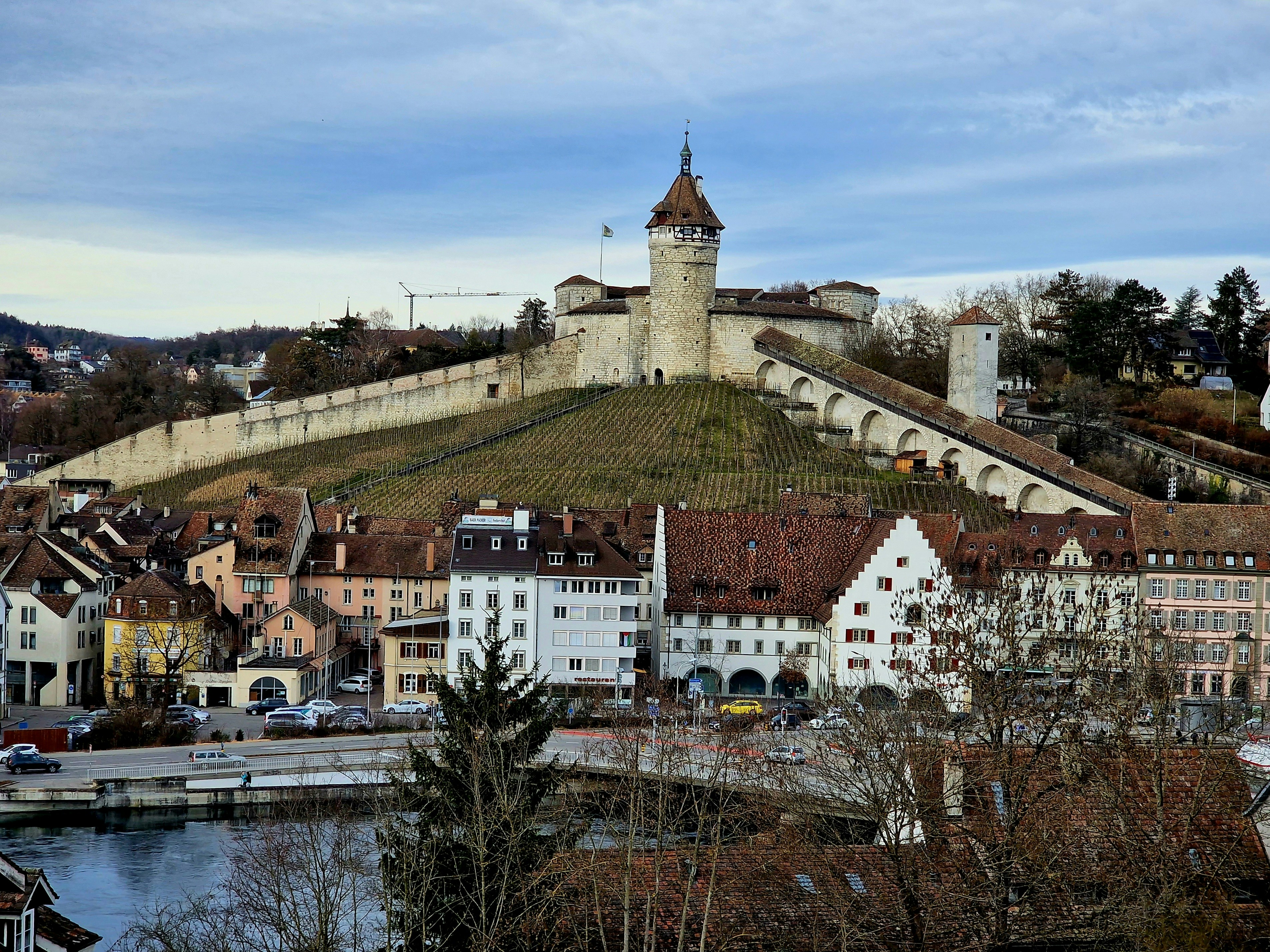 Dominando a paisagem da cidade, a Fortaleza de Munot é o seu maior símbolo. Esta fortificação circular do século XVI foi construída sobre uma colina coberta de vinhedos, oferecendo vistas panorâmicas espetaculares de Schaffhausen, do Rio Reno e da paisagem circundante. Uma curiosidade é o fosso da fortaleza, que, em vez de água, abriga uma família de veados. Todas as noites, às 21h, o guarda residente da torre toca o sino de Munot, uma tradição que antigamente sinalizava o fechamento dos portões da cidade.