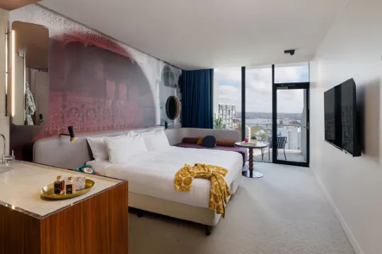 Os 105 quartos e suítes são santuários de design inteligente. Embora não sejam os maiores da cidade, seu layout é otimizado para o máximo conforto e funcionalidade. Cada quarto é uma cápsula da história local. As cabeceiras das camas, por exemplo, apresentam murais que retratam cenas da vida boêmia de Potts Point, enquanto os detalhes em latão e os móveis de linhas curvas remetem à era Art Déco. As janelas amplas não apenas inundam os quartos com luz natural, mas também emolduram vistas fascinantes, seja do vibrante letreiro da Coca-Cola, do tranquilo jardim do vizinho St. Vincent’s College ou do cintilante horizonte da cidade.