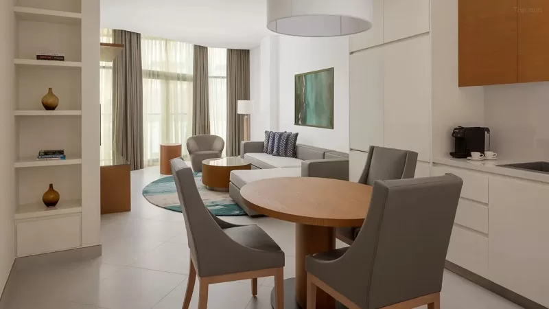O grande trunfo do Marriott Marquis Dubai Creek é, sem dúvida, a sua diversidade de acomodações, pensadas para quem precisa de mais do que um simples quarto de hotel. Com quinze categorias de quartos, o destaque vai para os apartamentos de um, dois e três quartos, que transformam a estadia em uma experiência residencial de alto padrão.